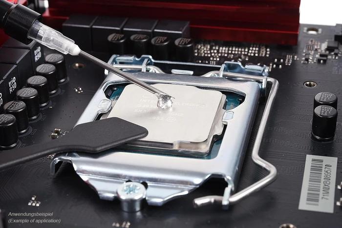 You can now apply a small drop of liquid metal to the center of the heat spreader. This should be smaller than a pea. The package contains two special cotton swabs for applying and spreading the liquid metal. This allows the Eisfrost Xtreme heat-conducting paste to be spread very well. However, you should take your time, as the high viscosity of liquid metal means that it can only be spread slowly.