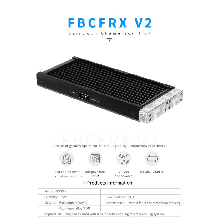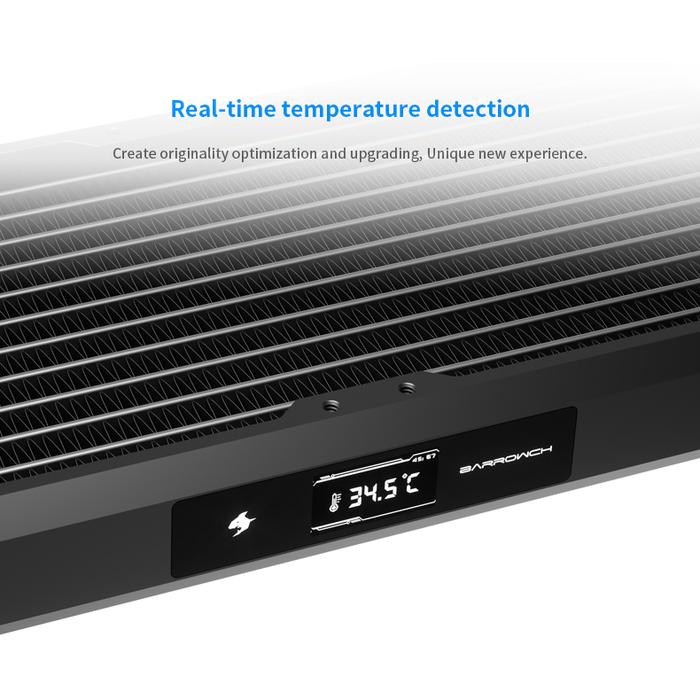 The Barrowch Chameleon Fish comes is either 120, 240, 360, and 480mm lengths. Comes with temperature display screen that can be changed to either side of the radiator. It has a changeable water chamber that can be change from PMMA to POM or vice versa. You also have the ability to change out the aluminum alloy borders to various colors to match the color scheme of your build.