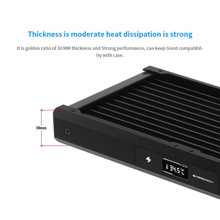 The Barrowch Chameleon Fish comes is either 120, 240, 360, and 480mm lengths. Comes with temperature display screen that can be changed to either side of the radiator. It has a changeable water chamber that can be change from PMMA to POM or vice versa. You also have the ability to change out the aluminum alloy borders to various colors to match the color scheme of your build.