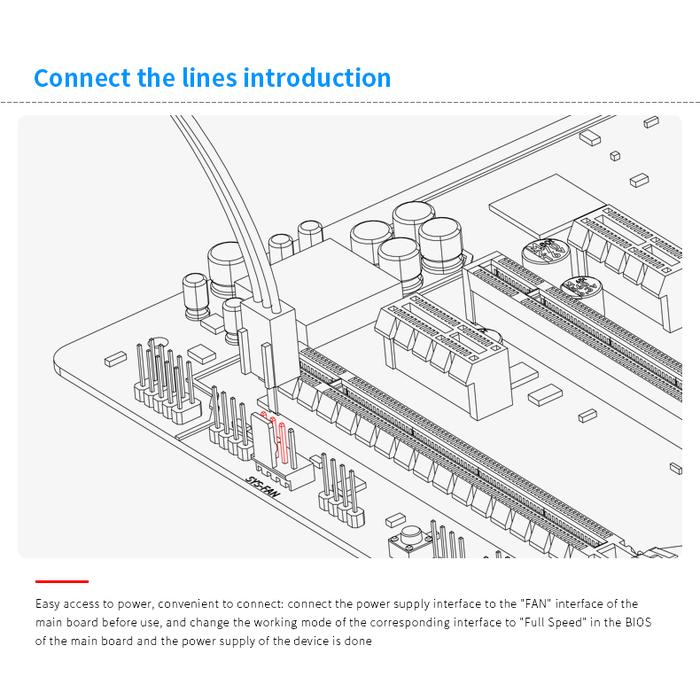 3.Please set the corresponding FAN interface speed in the motherboard BIOS to ““full speed” before power on.and keep the voltage at Stable 12V output to avoid equipment damage or abnormality due to low voltage.