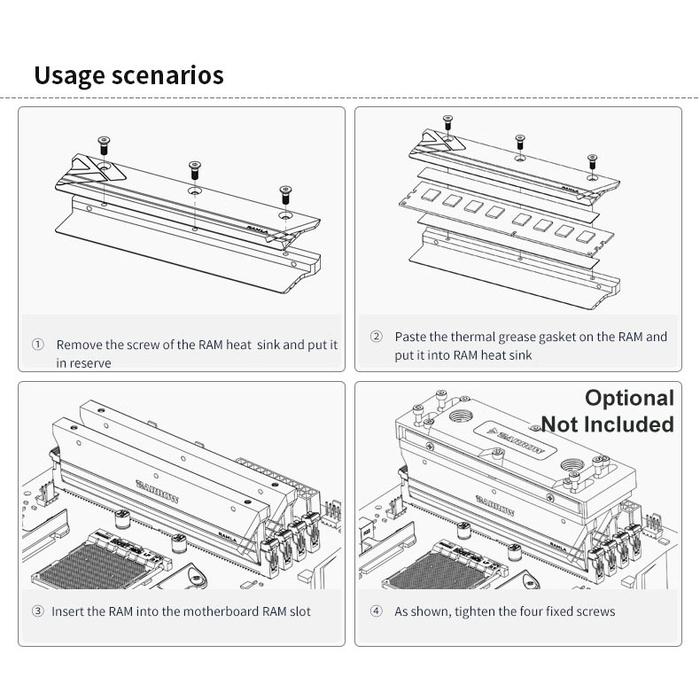 Untuk RAM yang memiliki Heatsink bawaan harus di lepas apabila akan menggunakan produk ini. Untuk memudahkan melepas heatsink RAM bawaan pabrik bisa dengan cara dipanaskan menggunakan heatgun agar themaltape bisa lepas. Hati-hati saat melepas heatsink bawaan pabrik karena bisa membuat IC RAM lepas atau merusak RAM anda.