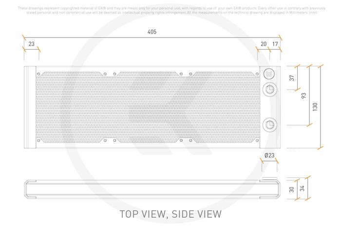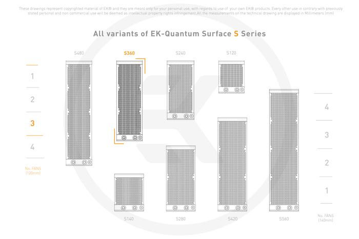 With a thickness of only 30mm, the EK-Quantum S Series Surface radiators are ideal for space-constrained cases. Despite the reduced thickness, they deliver exceptional performance at very low and medium fan speeds. A total of 16 copper 2mm wide tubes across the entire length of the radiator assure optimal coolant flow putting no stress on your cooling loop. High-grade non-louvered copper fins with 20 FPI density provide the best balance between thermal transfer and air resistance for optimal performance even at low-speed fan operation. A Push/Pull setup on an S Series EK-Quantum Surface radiator is not something EK would recommend since it will not bring a proportional performance increase. If more cooling power is needed, adding additional radiators is the way to go.