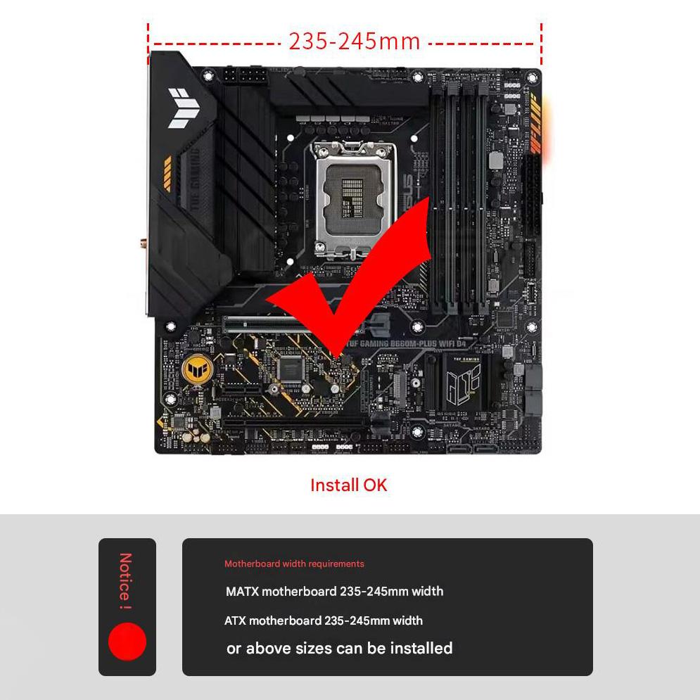 Lebar board yang compatible dengan CPU Cooler ini mulai 235-245mm atau lebih lebar. Info detail di foto produk